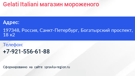Gelati Italiani, магазин мороженого по адресу 197348, Россия, Санкт-Петербург, Богатырский проспект, 18 к2 в дальнейшем Организация, размещена в следующих категориях: