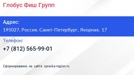Глобус-Фиш Групп по адресу 195027, Россия, Санкт-Петербург, Якорная, 17 в дальнейшем Организация, размещена в следующих категориях:
