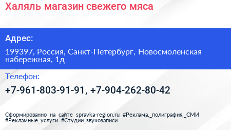 Халяль, магазин свежего мяса по адресу 199397, Россия, Санкт-Петербург, Новосмоленская набережная, 1д в дальнейшем Организация, размещена в следующих категориях: