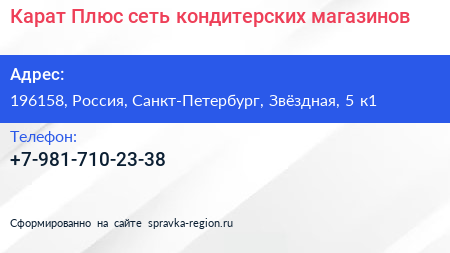 Карат Плюс, сеть кондитерских магазинов по адресу 196158, Россия, Санкт-Петербург, Звёздная, 5 к1 в дальнейшем Организация, размещена в следующих категориях: