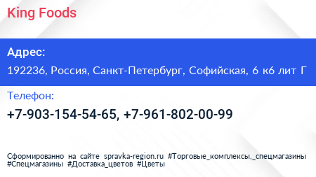 King Foods по адресу 192236, Россия, Санкт-Петербург, Софийская, 6 к6 лит Г в дальнейшем Организация, размещена в следующих категориях: