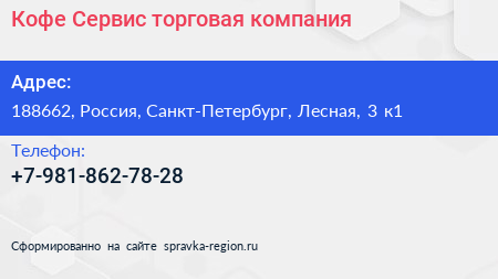 Кофе Сервис, торговая компания по адресу 188662, Россия, Санкт-Петербург, Лесная, 3 к1 в дальнейшем Организация, размещена в следующих категориях: