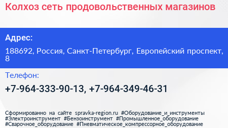 Колхоз, сеть продовольственных магазинов по адресу 188692, Россия, Санкт-Петербург, Европейский проспект, 8 в дальнейшем Организация, размещена в следующих категориях: