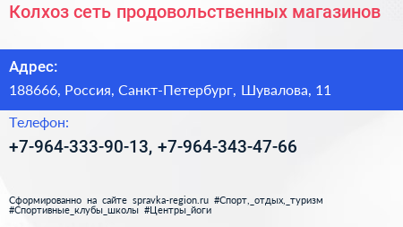 Колхоз, сеть продовольственных магазинов по адресу 188666, Россия, Санкт-Петербург, Шувалова, 11 в дальнейшем Организация, размещена в следующих категориях: