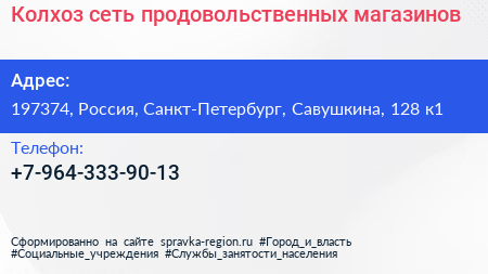 Колхоз, сеть продовольственных магазинов по адресу 197374, Россия, Санкт-Петербург, Савушкина, 128 к1 в дальнейшем Организация, размещена в следующих категориях: