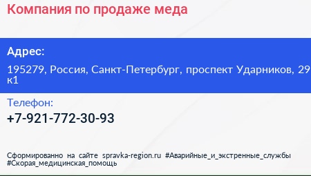 Компания по продаже меда по адресу 195279, Россия, Санкт-Петербург, проспект Ударников, 29 к1 в дальнейшем Организация, размещена в следующих категориях: