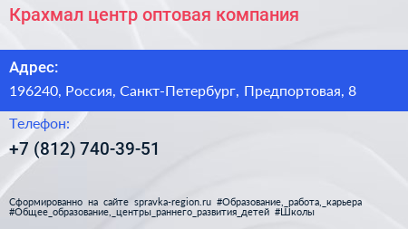 Крахмал-центр, оптовая компания по адресу 196240, Россия, Санкт-Петербург, Предпортовая, 8 в дальнейшем Организация, размещена в следующих категориях:
