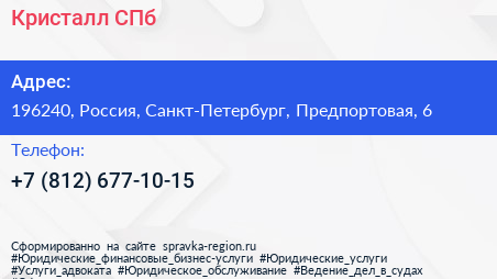Кристалл СПб по адресу 196240, Россия, Санкт-Петербург, Предпортовая, 6 в дальнейшем Организация, размещена в следующих категориях:
