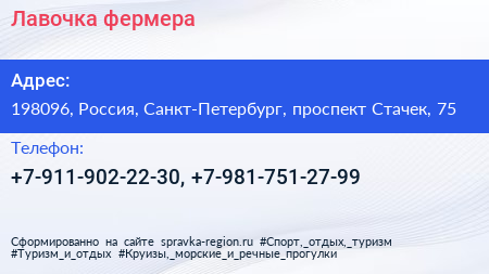 Лавочка фермера по адресу 198096, Россия, Санкт-Петербург, проспект Стачек, 75 в дальнейшем Организация, размещена в следующих категориях: