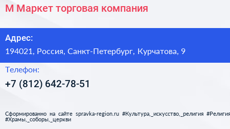 М-Маркет, торговая компания по адресу 194021, Россия, Санкт-Петербург, Курчатова, 9 в дальнейшем Организация, размещена в следующих категориях:
