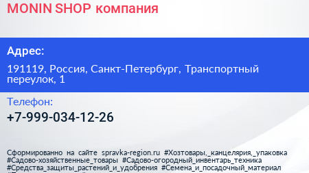 MONIN SHOP, компания по адресу 191119, Россия, Санкт-Петербург, Транспортный переулок, 1 в дальнейшем Организация, размещена в следующих категориях: