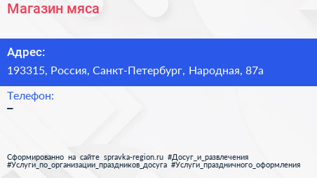 Магазин мяса по адресу 193315, Россия, Санкт-Петербург, Народная, 87а в дальнейшем Организация, размещена в следующих категориях: