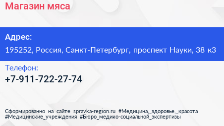 Магазин мяса по адресу 195252, Россия, Санкт-Петербург, проспект Науки, 38 к3 в дальнейшем Организация, размещена в следующих категориях: