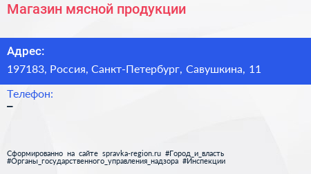 Магазин мясной продукции по адресу 197183, Россия, Санкт-Петербург, Савушкина, 11 в дальнейшем Организация, размещена в следующих категориях: