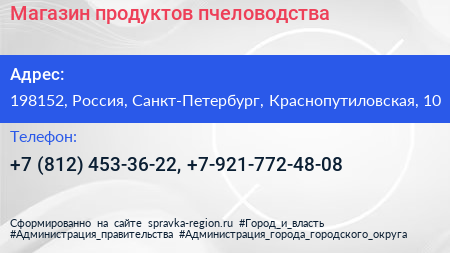 Магазин продуктов пчеловодства по адресу 198152, Россия, Санкт-Петербург, Краснопутиловская, 10 в дальнейшем Организация, размещена в следующих категориях: