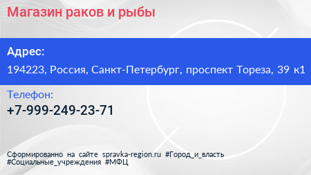 Магазин раков и рыбы по адресу 194223, Россия, Санкт-Петербург, проспект Тореза, 39 к1 в дальнейшем Организация, размещена в следующих категориях: