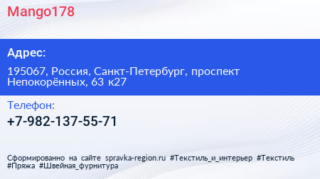 Mango178 по адресу 195067, Россия, Санкт-Петербург, проспект Непокорённых, 63 к27 в дальнейшем Организация, размещена в следующих категориях: