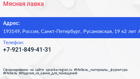 Мясная лавка по адресу 193149, Россия, Санкт-Петербург, Русановская, 19 к2 лит А в дальнейшем Организация, размещена в следующих категориях: