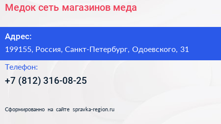 Медок, сеть магазинов меда по адресу 199155, Россия, Санкт-Петербург, Одоевского, 31 в дальнейшем Организация, размещена в следующих категориях: