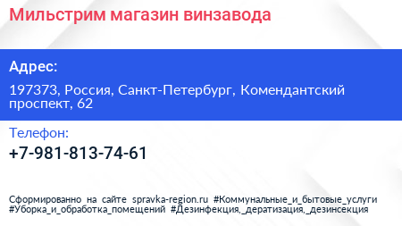 Мильстрим, магазин винзавода по адресу 197373, Россия, Санкт-Петербург, Комендантский проспект, 62 в дальнейшем Организация, размещена в следующих категориях: