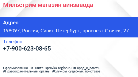 Мильстрим, магазин винзавода по адресу 198097, Россия, Санкт-Петербург, проспект Стачек, 27 в дальнейшем Организация, размещена в следующих категориях: