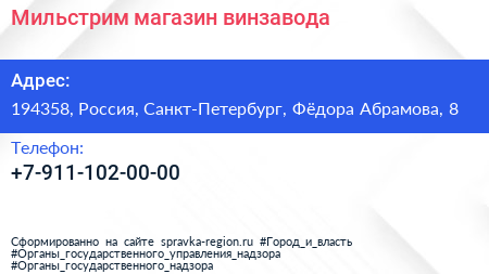 Мильстрим, магазин винзавода по адресу 194358, Россия, Санкт-Петербург, Фёдора Абрамова, 8 в дальнейшем Организация, размещена в следующих категориях: