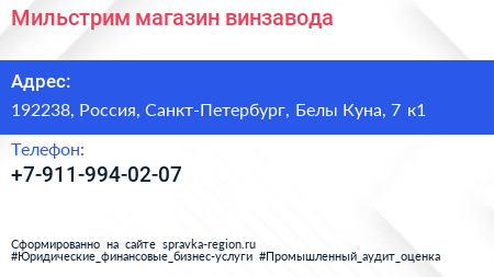 Мильстрим, магазин винзавода по адресу 192238, Россия, Санкт-Петербург, Белы Куна, 7 к1 в дальнейшем Организация, размещена в следующих категориях: