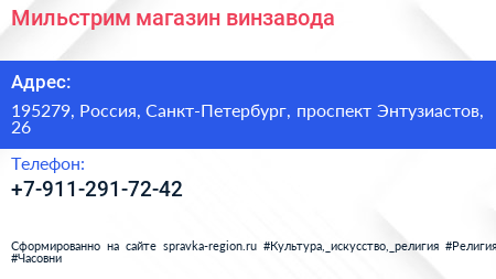 Мильстрим, магазин винзавода по адресу 195279, Россия, Санкт-Петербург, проспект Энтузиастов, 26 в дальнейшем Организация, размещена в следующих категориях: