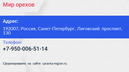 Мир орехов по адресу 192007, Россия, Санкт-Петербург, Лиговский проспект, 130 в дальнейшем Организация, размещена в следующих категориях: