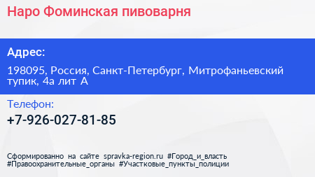 Наро-Фоминская пивоварня по адресу 198095, Россия, Санкт-Петербург, Митрофаньевский тупик, 4а лит А в дальнейшем Организация, размещена в следующих категориях: