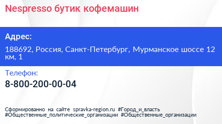 Nespresso, бутик кофемашин по адресу 188692, Россия, Санкт-Петербург, Мурманское шоссе 12 км, 1 в дальнейшем Организация, размещена в следующих категориях: