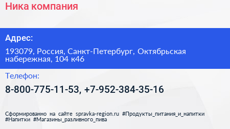 Ника, компания по адресу 193079, Россия, Санкт-Петербург, Октябрьская набережная, 104 к46 в дальнейшем Организация, размещена в следующих категориях: