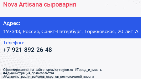 Nova Artisana, сыроварня по адресу 197343, Россия, Санкт-Петербург, Торжковская, 20 лит А в дальнейшем Организация, размещена в следующих категориях: