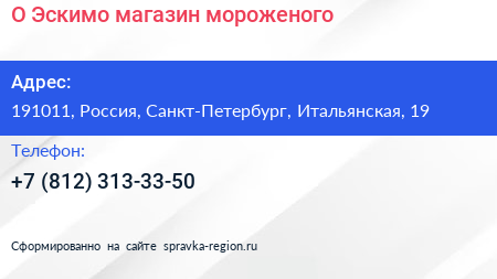 О! Эскимо, магазин мороженого по адресу 191011, Россия, Санкт-Петербург, Итальянская, 19 в дальнейшем Организация, размещена в следующих категориях: