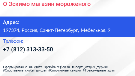 О! Эскимо, магазин мороженого по адресу 197374, Россия, Санкт-Петербург, Мебельная, 9 в дальнейшем Организация, размещена в следующих категориях: