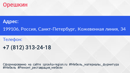 Орешкин по адресу 199106, Россия, Санкт-Петербург, Кожевенная линия, 34 в дальнейшем Организация, размещена в следующих категориях:
