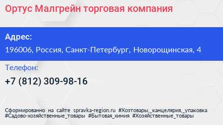Ортус Малгрейн, торговая компания по адресу 196006, Россия, Санкт-Петербург, Новорощинская, 4 в дальнейшем Организация, размещена в следующих категориях: