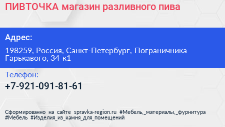 ПИВТОЧКА, магазин разливного пива по адресу 198259, Россия, Санкт-Петербург, Пограничника Гарькавого, 34 к1 в дальнейшем Организация, размещена в следующих категориях: