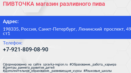 ПИВТОЧКА, магазин разливного пива по адресу 198335, Россия, Санкт-Петербург, Ленинский проспект, 49 ст1 в дальнейшем Организация, размещена в следующих категориях: