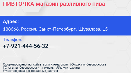 ПИВТОЧКА, магазин разливного пива по адресу 188666, Россия, Санкт-Петербург, Шувалова, 15 в дальнейшем Организация, размещена в следующих категориях: