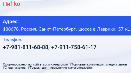 Пиf`ko по адресу 188678, Россия, Санкт-Петербург, шоссе в Лаврики, 57 к1 в дальнейшем Организация, размещена в следующих категориях: