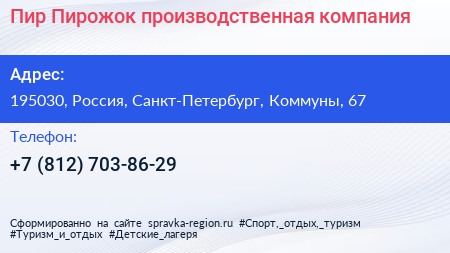 Пир-Пирожок, производственная компания по адресу 195030, Россия, Санкт-Петербург, Коммуны, 67 в дальнейшем Организация, размещена в следующих категориях: