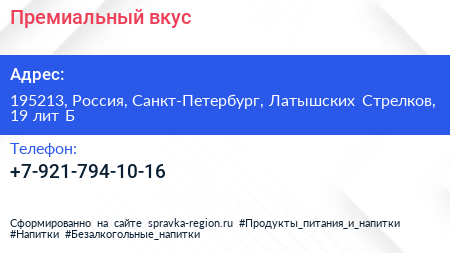 Премиальный вкус по адресу 195213, Россия, Санкт-Петербург, Латышских Стрелков, 19 лит Б в дальнейшем Организация, размещена в следующих категориях: