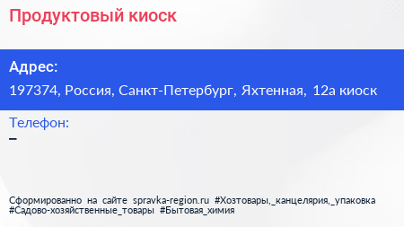 Продуктовый киоск по адресу 197374, Россия, Санкт-Петербург, Яхтенная, 12а киоск в дальнейшем Организация, размещена в следующих категориях: