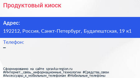 Продуктовый киоск по адресу 192212, Россия, Санкт-Петербург, Будапештская, 19 к1 в дальнейшем Организация, размещена в следующих категориях: