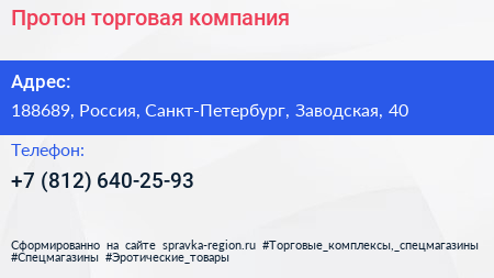 Протон, торговая компания по адресу 188689, Россия, Санкт-Петербург, Заводская, 40 в дальнейшем Организация, размещена в следующих категориях: