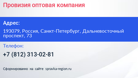 Провизия, оптовая компания по адресу 193079, Россия, Санкт-Петербург, Дальневосточный проспект, 73 в дальнейшем Организация, размещена в следующих категориях: