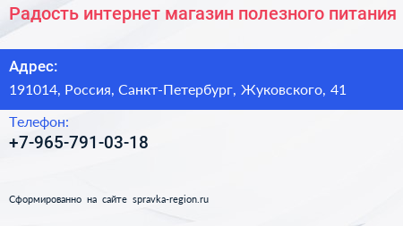 Радость, интернет-магазин полезного питания по адресу 191014, Россия, Санкт-Петербург, Жуковского, 41 в дальнейшем Организация, размещена в следующих категориях: