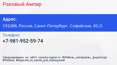 Раковый Ампир по адресу 192288, Россия, Санкт-Петербург, Софийская, 81/2 в дальнейшем Организация, размещена в следующих категориях: