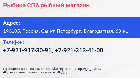Рыбика СПб, рыбный магазин по адресу 196105, Россия, Санкт-Петербург, Благодатная, 63 к1 в дальнейшем Организация, размещена в следующих категориях: